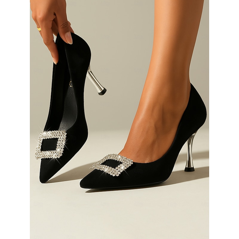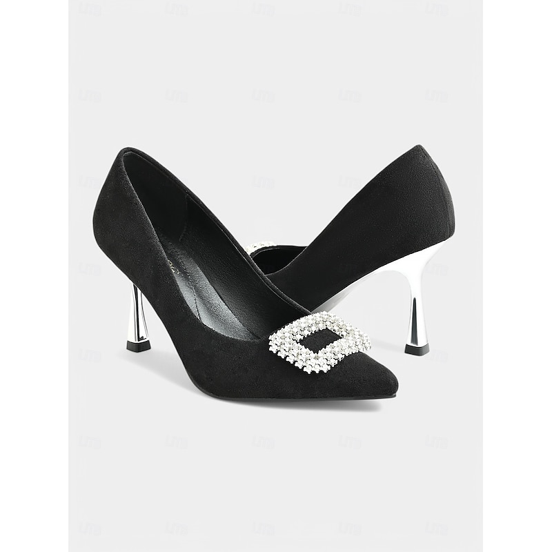 HOT ! Women's Black Suede Stiletto Heels with Rhinestone Buckle – Sophisticated Pointed Toe Evening Pumps for Prom and Cocktail Occasions