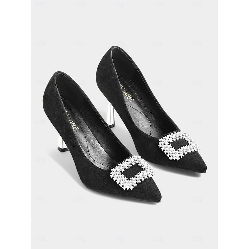 Women's Black Suede Stiletto Heels with Rhinestone Buckle – Sophisticated Pointed Toe Evening Pumps for Prom and Cocktail Occasions 16