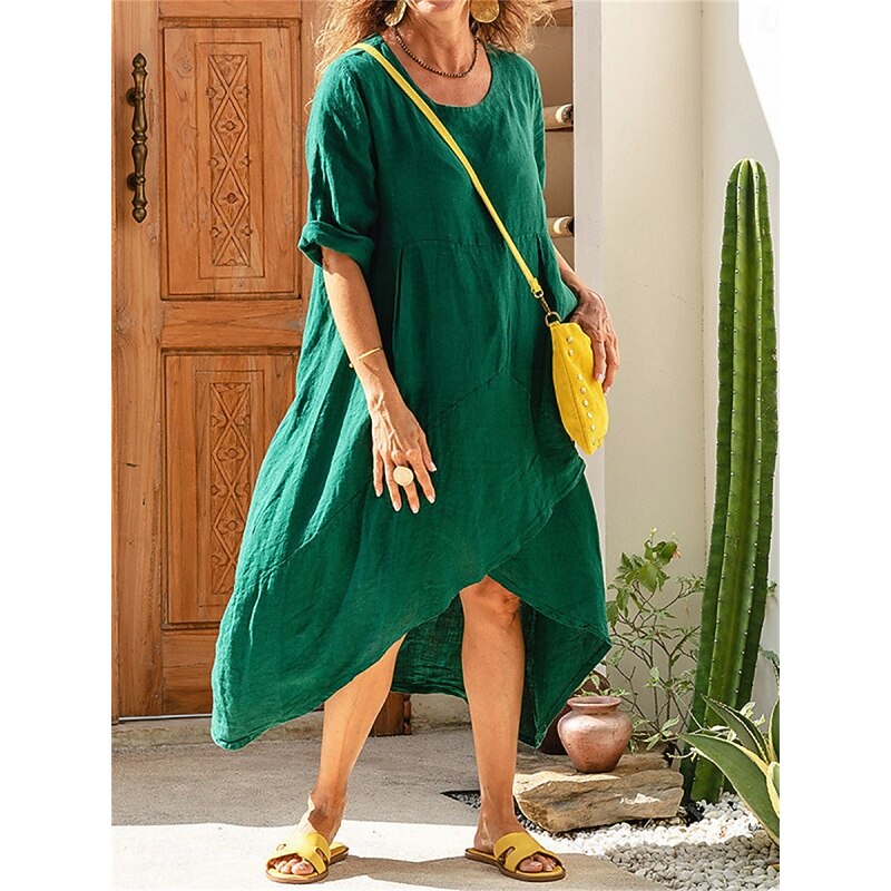 HOT ! Women's Midi Dress A Line Dress Summer Dress Casual Daily Loose Fit Plain 3/4 Length Sleeve Notched Neck White Purple Green Army Green Summer