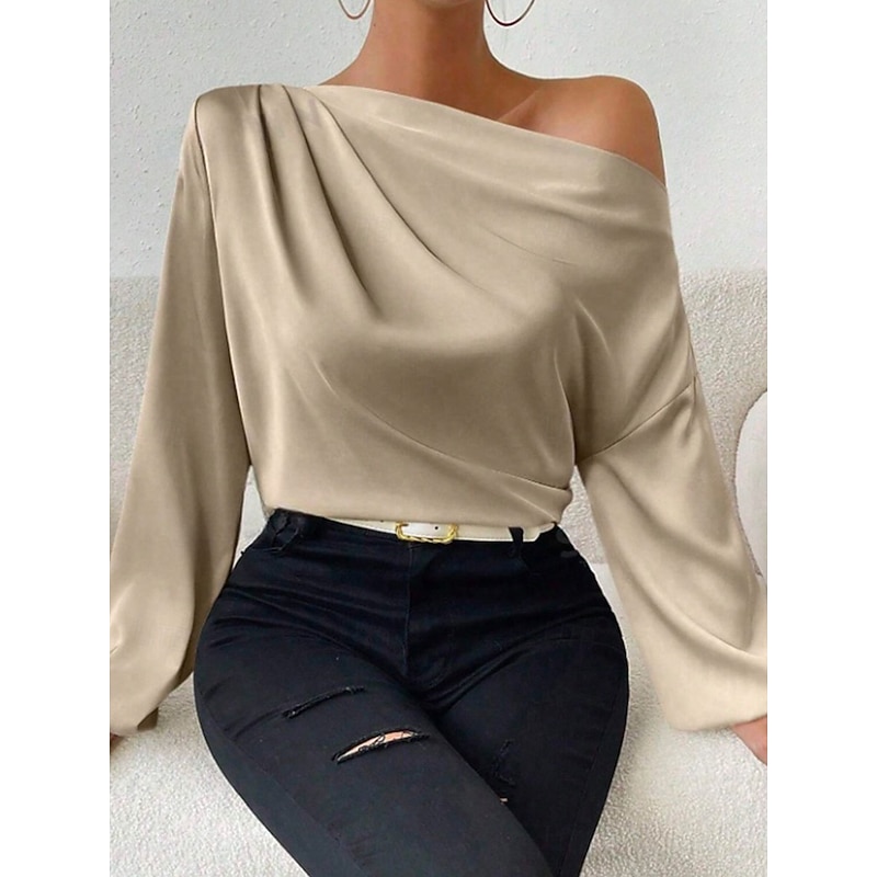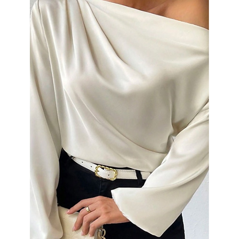 More information about Women's Elegant Dressy Satin Blouse Solid Color Basic Casual Long Sleeve Lantern Sleeve Asymmetrical Regular Tops Work Daily Holiday Ruched Patchwork White Green Beige Spring Fall