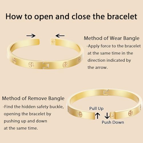 • 【 Easy to use 】The Love Cross Bangle Bracelet features a concealed clasp design that enhances its aesthetic appeal while ensuring a secure, slip-resistant fit on the wrist. Crafted in 18k gold, this love bangle bracelet is exceptionally user-friendly: to open or close, gently pull the top section with your index finger while simultaneously pressing the bottom part with your thumb, allowing effortless wear and removal.