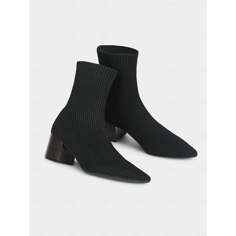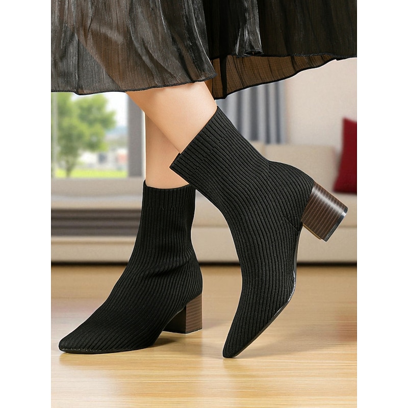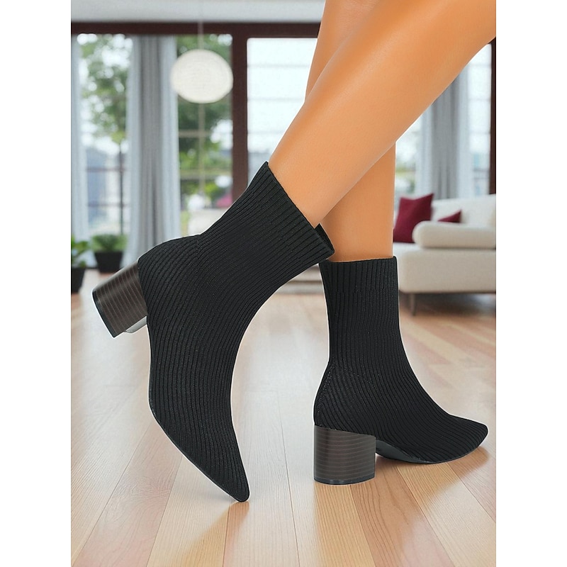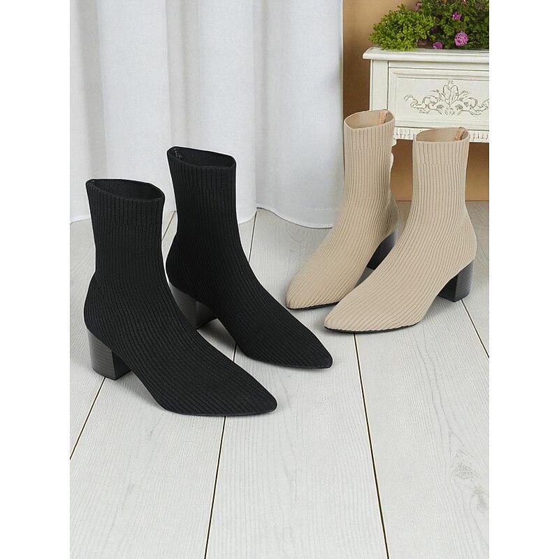 Women's Beige Knit Sock Ankle Boots with Block Heels – Stretch Pointed Toe Booties for Casual Daily Wear and Fall Outfits 12