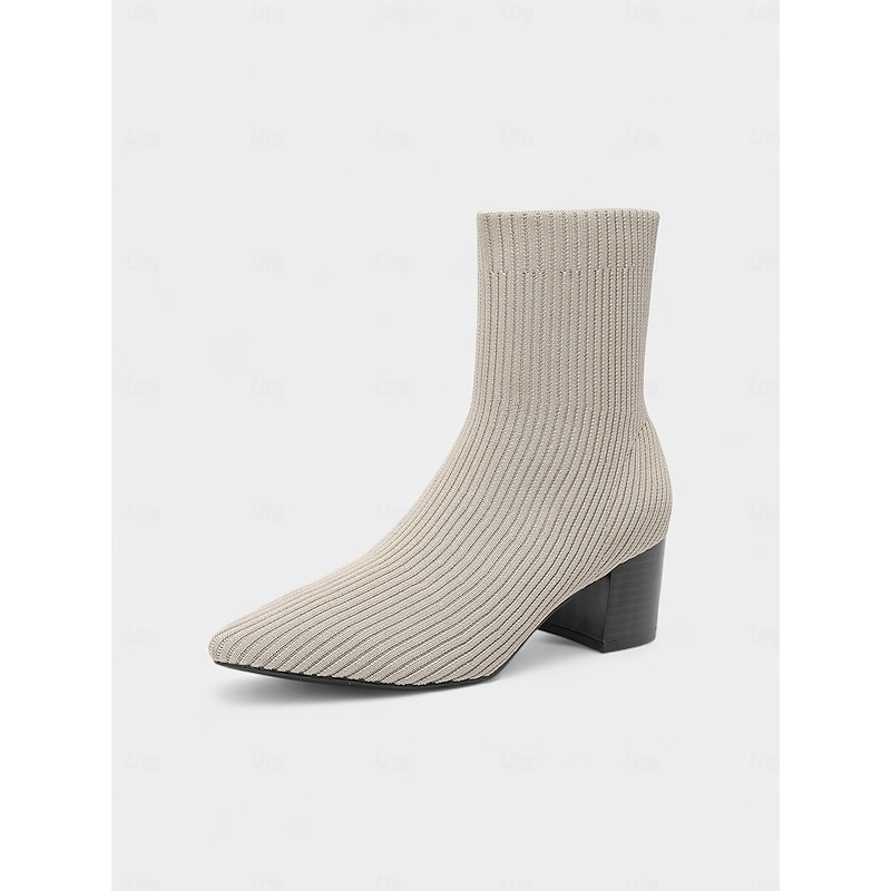 HOT ! Women's Beige Knit Sock Ankle Boots with Block Heels – Stretch Pointed Toe Booties for Casual Daily Wear and Fall Outfits