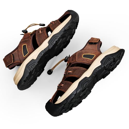 Sole material: RubberOuter material: LeatherFlexible: Elastic band with locking mechanism design, make it easy to put on and take off in a hurry. You can quickly adjust the closed toe sandals for men according to the width of your feetNon Slip: These hiking sandals for men have anti-slip rubber sole with bump texture, which has strong grip to help keep balance in slippery placeProtective: Wide toe cap and thick soles, protect your feet from getting hurt by rock and stone, or sharp objects. These athletic sandals for men provide your feet some cushion and protectionLightweight & plush: Stitching vamp leather upper and breathable lining, a light mens outdoor sandals with cushion sole and foot bed, provide you all day comfortWidely Applications: These sandals for men wide width are suitable for daily wearing, hiking, walking, outdoor, athletic, water sports, beach and other activities Perfect for everyday use. premium materials and excellent craftsmanship ensure long-lasting durability.