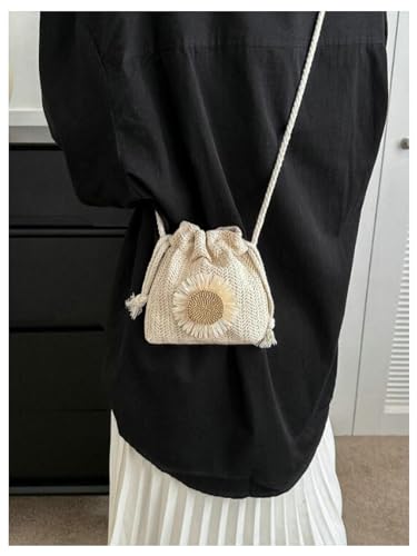 HOT ! OYOANGLE Women's Straw Crossbody Bag Flower Decor Drawstring Bucket Handbag Vacation Mini Purse