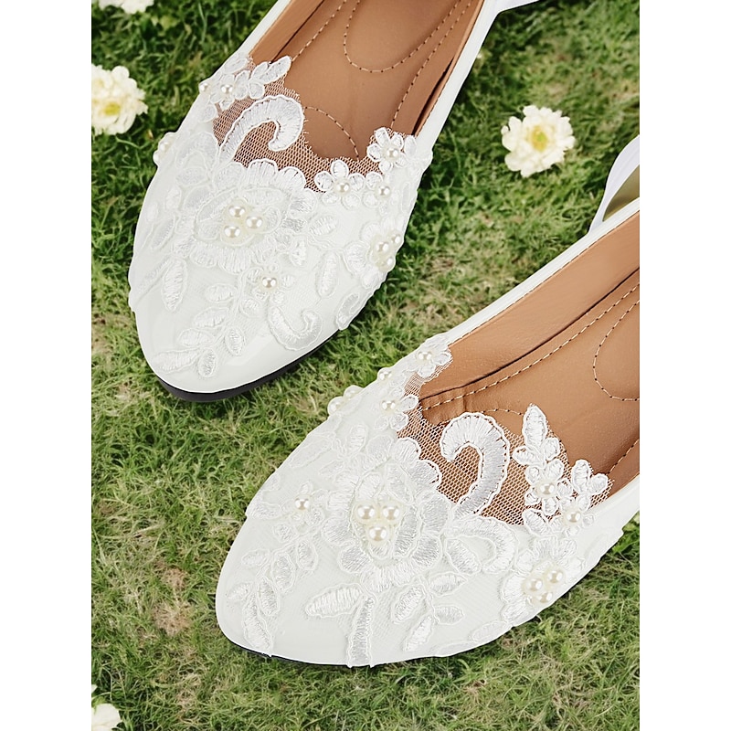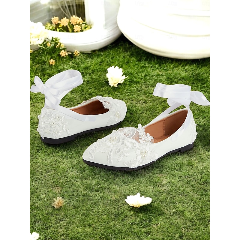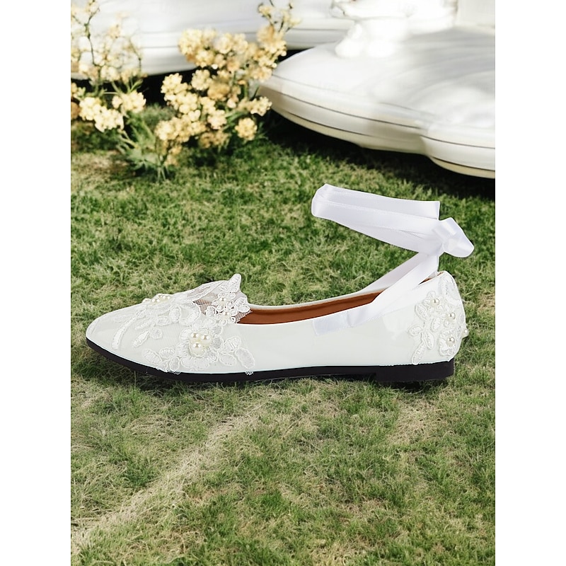 White Lace Bridal Flats with Ribbon Ties - Elegant Wedding Shoes for Women Featuring Floral Embroidery 1