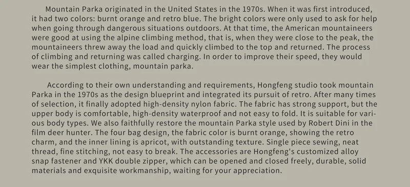 Red Tornado Men's Mountain Parka Vintage-Inspired Outdoor Jacket Burnt Orange ? Based on the orange Mountain Parka worn by Robert De Niro in the 1978 film, The Deer Hunter ? 100% polyester shell fabric ? Four large vertical pockets front ? Velcro adjustable cuffs ? Button-up storm flap for extra protection of the YKK two-way zip ? Authentic colors, shell in burnt orange and lining in tan ? Protective hood with snap buttons at front and adjustable drawstring ? Drawstring at hem interior ? Relaxed Fit TIPS - due to the different monitor and light effect, the actual color of the item might be slightly different from the color showed on the pictures. Please understand that. Thank you�� - Items will be shipped within 1-5 business days after we verify your payment. - Please tell me your current address after your payment within 1-2 days; otherwise,we will ship your item based on your Escrow address, so make sure it is correct. - Sometimes it would be longer because of the bad weather, a waste of time in customs clearance. - Thus please wait patiently when you do not receive your item on time. If you don't receive the item within thirty days, please contact us, and then I will help you track it. REFUNDS - If you want a refund because of the item defect or some other quality problems, please contact us within 7 days after you get it. the fee relating to the reback mailing should be overtaken by yourself. FEEDBACK