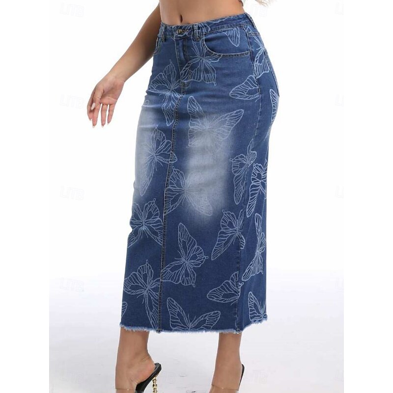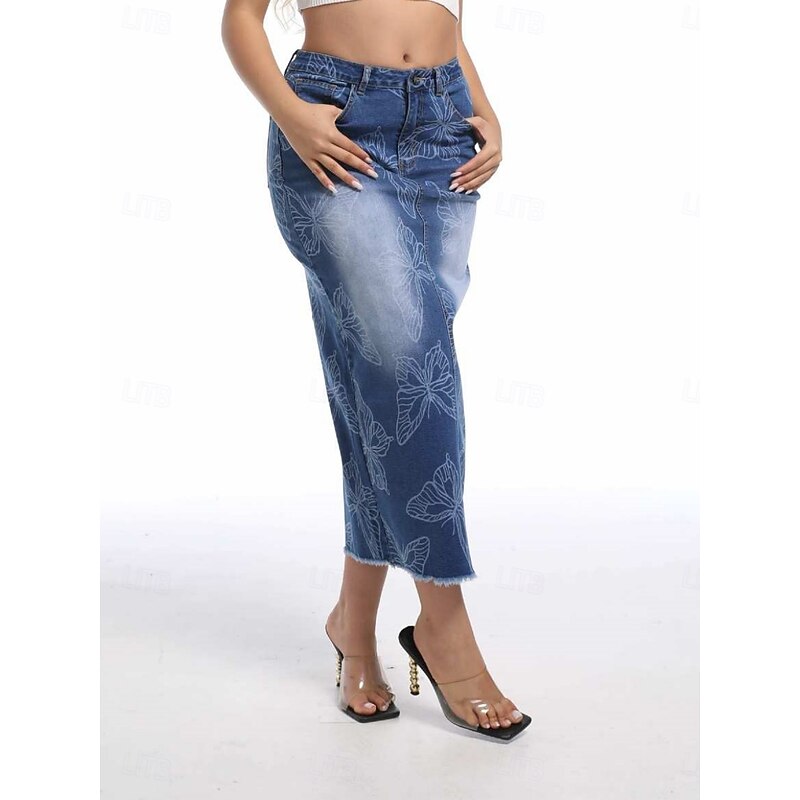 HOT ! Women's Skirt Bodycon Fashion Casual Midi High Waist Skirts Floral Pocket Print Inelastic Street Daily Blue Spring Polyester Denim