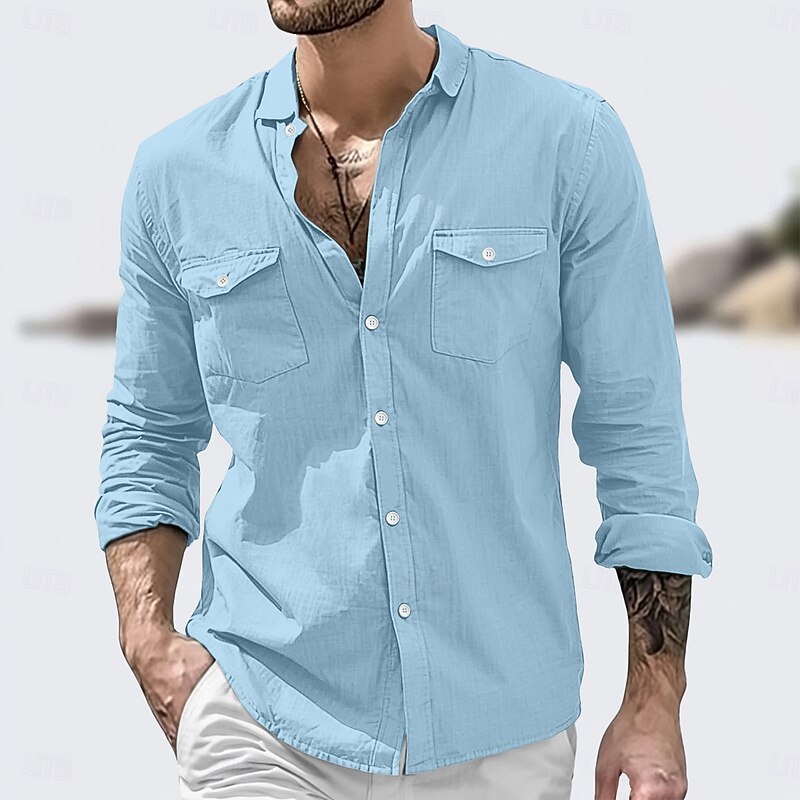 HOT ! Men's Shirt Linen Shirt Summer Shirt Beach Wear Button Up Shirt Solid Color Vacation Street White Green Khaki Light Blue Long Sleeve Turndown Summer Clothing Apparel Pocket