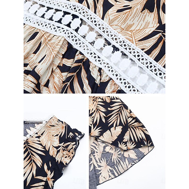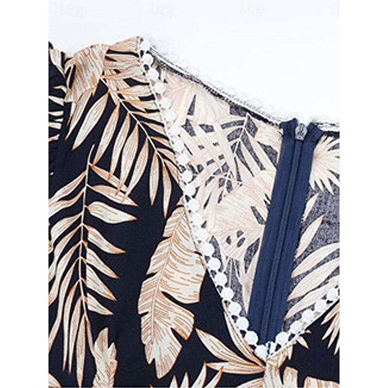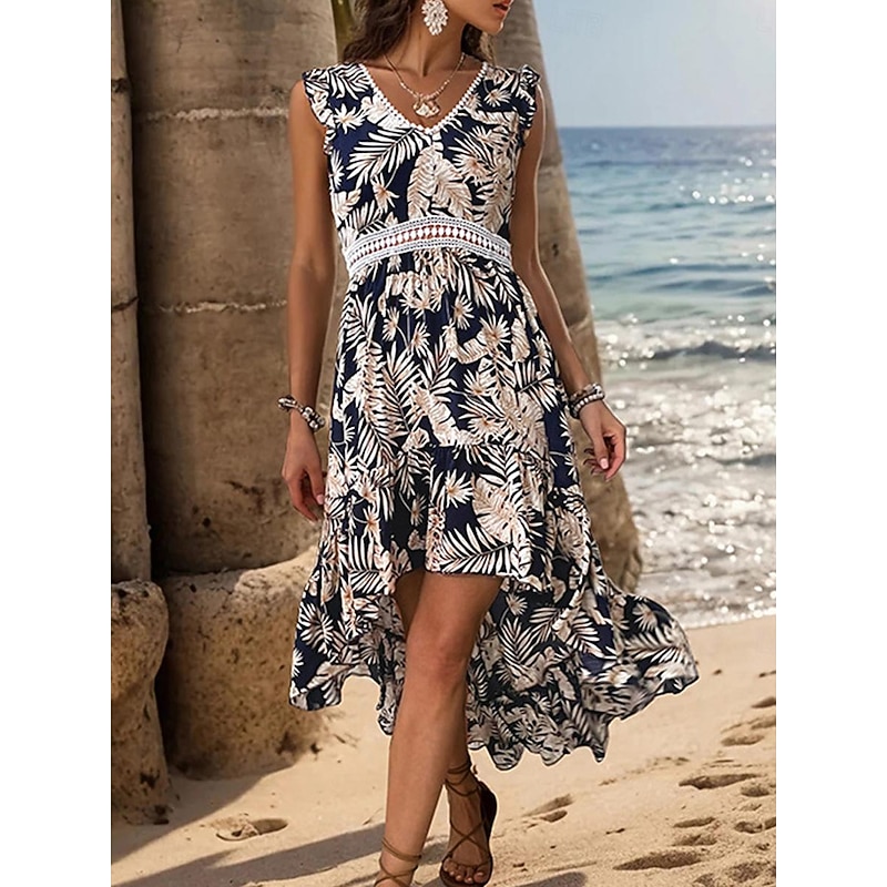 Highlights [Fabric:] Crafted from high-quality polyester, this casual dress offers a lightweight and breathable option for summer. The fabric's micro-elasticity ensures a comfortable fit, making it ideal for warm weather outings. [Fit & Style:] With a regular fit, this dress showcases an elegant A-line silhouette that flatters various body types. Its flowing asymmetrical hemline adds a trendy and dynamic flair, perfect for casual and stylish looks. [Design Highlights:] This vibrant dress features a striking all-over tropical leaf and floral print on a navy blue background, capturing a fresh and relaxed vibe. The chic V-neckline and sleeveless design enhance its breezy appeal, while the crochet waistband detail offers a touch of elegance and definition to the waist. [Occasions:] Ideal for dates, vacations, and daily wear, this dress effortlessly transitions from day to night. Whether you're enjoying a tropical getaway or a casual summer outing, this dress is a versatile choice for a variety of occasions. [Size Range:] Available in sizes S, M, L, and XL, ensuring a suitable fit for different preferences and body types.