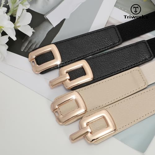 2 Pack Women Skinny Elastic Waist Belt for Dress Ladies Thin Stretch Belt with Gold Buckle 4