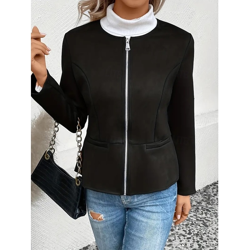 The jacket is equipped with a chic front zipper closure for a modern and sophisticated vibe. The solid color pattern enhances its versatility, making it a staple piece in any wardrobe. Its vintage style adds a touch of nostalgia, while the clean lines keep it contemporary.