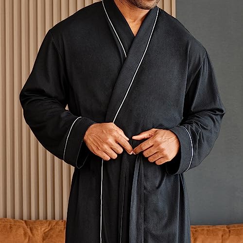 • This mid-calf length, lightweight bathrobe men features a traditional shawl collar, cuffed sleeves and contrasting color piping throughout.