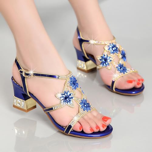 HOT ! Women's Genuine Leather Crystal Dress Block Heel Sandals Fashion Rhinestone Flower Decor Round Open Toe Adjustable Ankle Buckle Casual Chunky Heel Sandals for Party Wedding Work