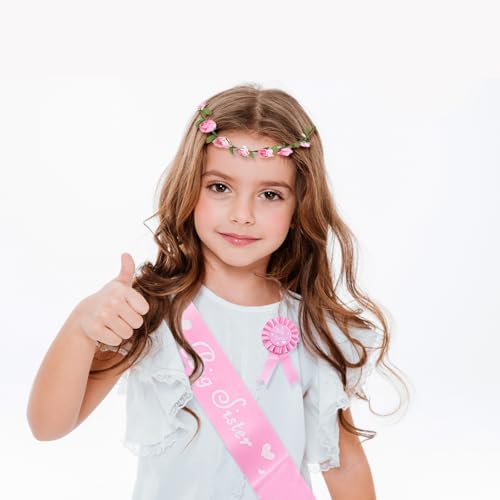 3PCS Big Sister Gifts for Girls,Sister to Be Accessory Set,Including Flower Wreath, Big Sister Satin Sash and Badge Pin for Baby Shower Party Announcement Party Decorations Pink 7