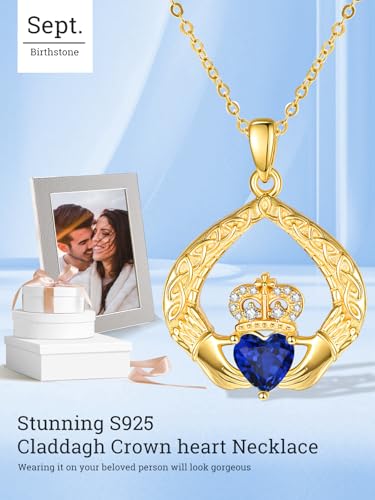 • 【September Birthstone Claddagh Necklace - Love Gifts for Women】Claddagh necklace symbolizes loyal love.The claddagh necklace with 1 natural sapphire jewelry. Chain length is 18"+2", pendant size is 0.83", Silver weight:2.8g.