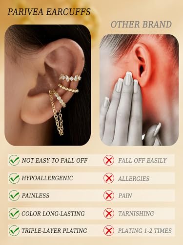 Material: MetalMetal type: BrassGem type: Cubic Zirconia✨Luxe Designs for Effortless Layering--Create your signature look with 6 adjustable ear cuffs in contemporary styles—minimalist hoops, intricate swirls, CZ-studded accents, and geometric shapes. Perfect for stacking or wearing solo, these non-piercing earrings add instant edge to any outfit💎Hypoallergenic Comfort--Crafted from durable copper with thick 14K gold electroplating, our clip on cartilage earrings resist fading and tarnish. Smooth edges and nickel-free/lead-free materials ensure all-day comfort, even for sensitive ears🌟Adjustable Fit for Every Ear Shape--Open-back design with flexible copper allows fake earrings easy customization—gently bend to hug your helix, snugly grip your cartilage, or rest delicately on your lobe. No slipping, no pressure points, just secure elegance🎁Gift Ready--Presented in a box —ideal for birthdays, bridesmaids, or self-care splurges. A versatile dainty cuff for non pierced ears jewelry essential, suitable for any occasions like parties, wedding wearing, daily life, work, school, holiday etc💖PARIVAE’s Quality--Creates jewelry for the modern love story. Every gold ear cuff undergoes triple-layer plating and wearing-testing for ear jewelry integrity. Simply store dainty clip on earrings in pouch when not in use and avoid exposure to chemicals Perfect for everyday use. premium materials and excellent craftsmanship ensure long-lasting durability.