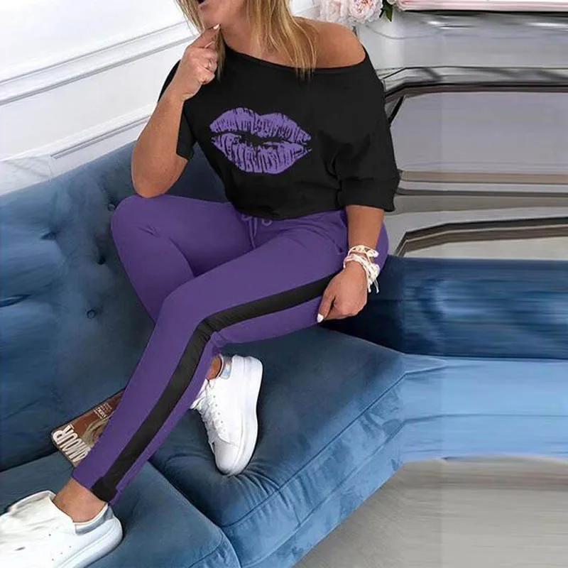 New Style Lip Print Round Neck Sports Set. S-xl