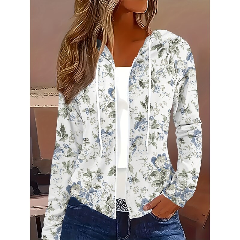 Women's Hoodie Jacket Comfortable Zipper Vintage Sports Fashion Floral School Vacation Home Casual Short Hooded Regular Fit Long Sleeve Outerwear White Red Blue Spring Fall 9