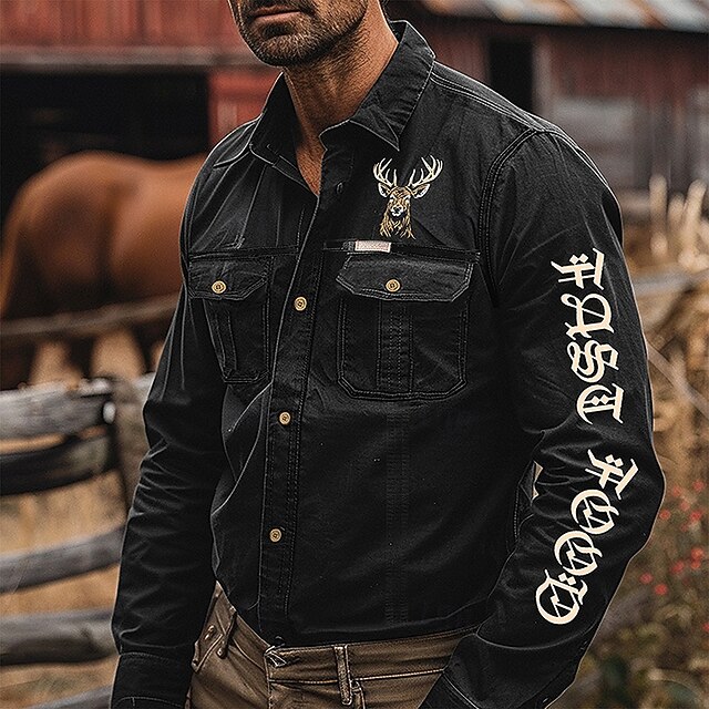 Men's Cowboy Deer Work Shirt Western Shirt Cargo Shirt Long Sleeve Vintage Casual Tactical Sports & Outdoor Going out Winter Spring &  Fall Turndown Print Black 1