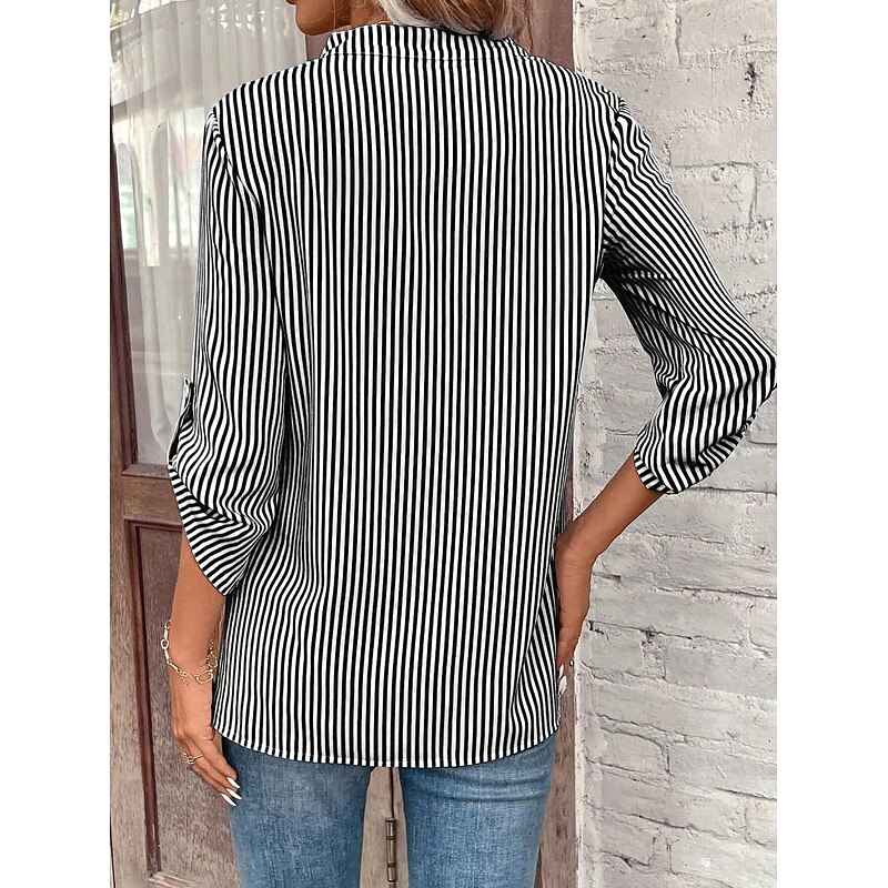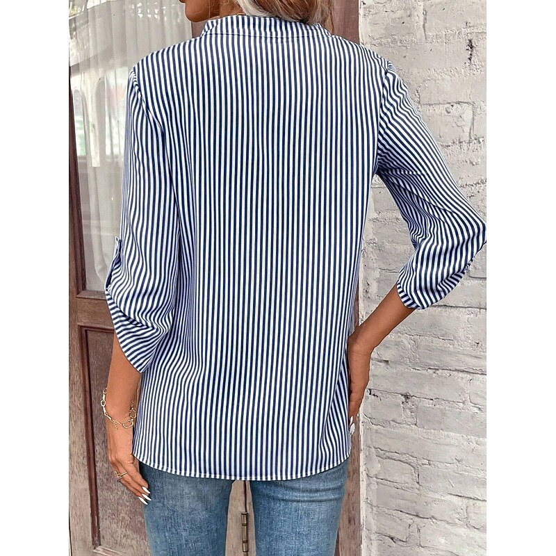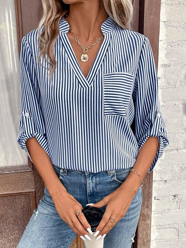 Highlights [Fabric] : Crafted from breathable polyester, this blouse ensures comfort and mobility with its lightweight material, making it ideal for warmer seasons. [Fit] : Designed with a regular fit, this top offers a flattering silhouette, perfect for everyday wear. The micro-elastic quality provides a slight stretch for added comfort. [Design Highlights] : Featuring classic blue and white vertical stripes, this blouse includes a stylish V-neckline for a feminine touch. The sleeves can be rolled up and secured with button tabs, giving it a versatile and chic appearance. A single chest pocket adds both function and a subtle design element to the blouse. [Occasions] : This blouse is perfect for daily wear, from casual outings to more polished occasions. Pair it with jeans for a relaxed look or dress it up with tailored pants or a skirt for a sophisticated ensemble. [Sizes] : Available in a range of sizes from S to XL, ensuring a suitable fit for various body types.