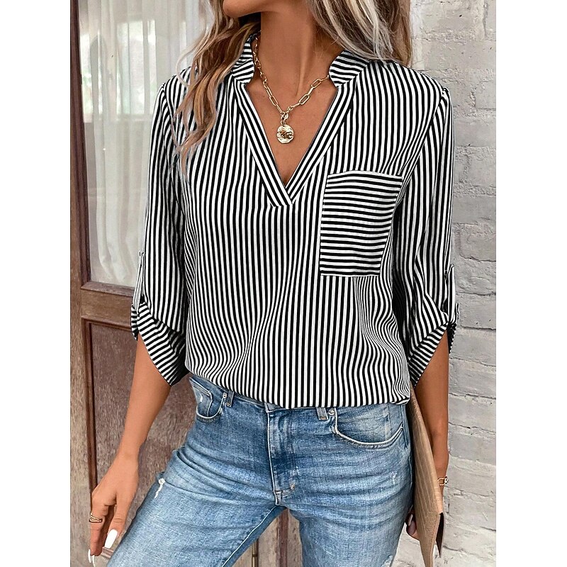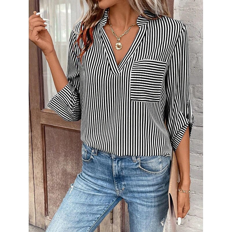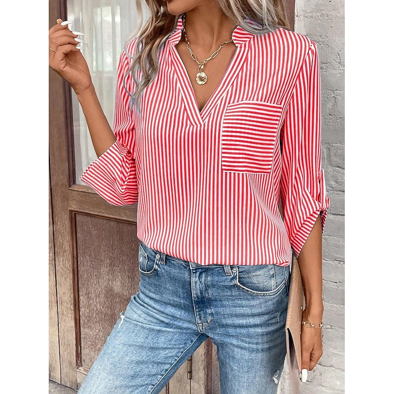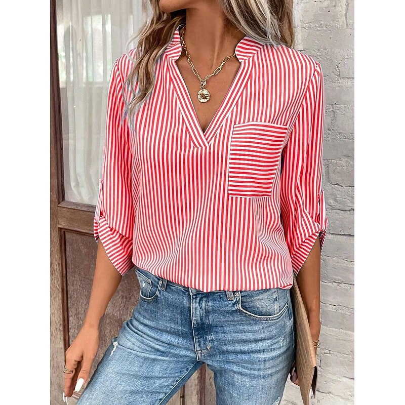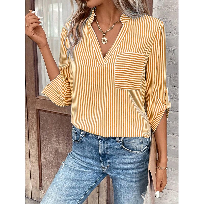 HOT ! Women's Shirt Blouse Casual Striped Pocket Print Long Sleeve Regular Tops V Neck Daily Black Yellow Red Royal Blue Spring & Summer