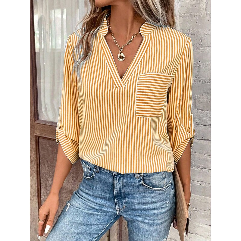 Women's Shirt Blouse Casual Striped Pocket Print Long Sleeve Regular Tops V Neck Daily Black Yellow Red Royal Blue Spring & Summer 13