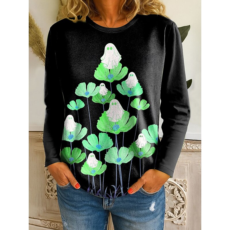 Halloween Women's T shirt Ghost Floral Graphic Vintage Fashion Stylish Long Sleeve Crew Neck Round Neck Regular Tops Daily Print Pink Blue Orange Green Fall Winter 7