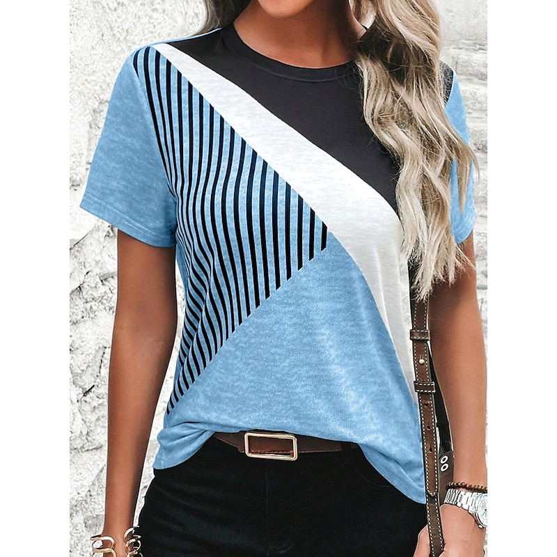 Highlights [Fabric]: Crafted from a soft polyester blend, this women's t-shirt ensures a comfortable and breathable fit, perfect for warm summer days. The micro-elastic fabric provides ease of movement and retains its shape even after multiple washes. [Fit]: The t-shirt boasts a regular fit with short sleeves and a classic round neckline, delivering a relaxed yet stylish look that pairs effortlessly with jeans or shorts. [Design Highlights]: Featuring a unique color block print, the t-shirt incorporates a modern geometric design with sky blue, gray, and khaki hues. The asymmetrical stripe pattern adds a contemporary twist, making it a standout piece for casual wear. [Occasions]: Ideal for daily wear, this casual t-shirt is suitable for a variety of settings, whether you're heading out for a day of errands or meeting friends for a casual lunch. Its versatile design makes it a staple for any summer wardrobe. [Size Range]: Available in a range of sizes from S to 2XL, this t-shirt is designed to accommodate a variety of body types, ensuring a comfortable fit for everyone.
