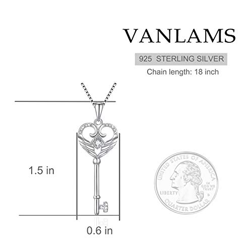 HOT ! VANLAMS S925 Sterling Silver Angel Wings Necklace for Women, Love Heart Pendant with Butterfly Key - Birthday Gifts