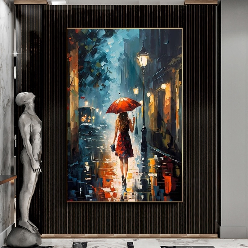 Girl in Rainy City Canvas Handpainted Girl In Street With Umbrella Rain Abstract Decor Street Wall Girl In New York City Girls Room Wall Art Home Decor No Frame 4