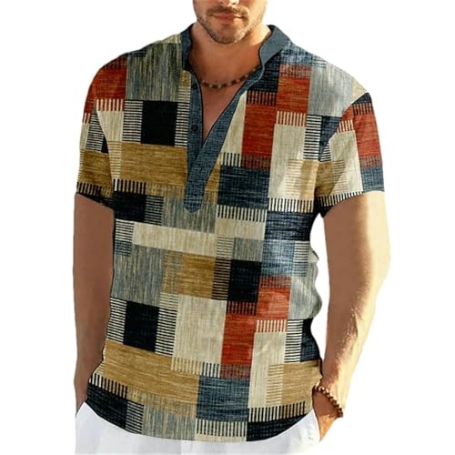 Men's Vintage Patchwork Color Block 3D Print Henley Shirts Man Stand Collar Short Sleeve T Shirt Male Tees Tops 4