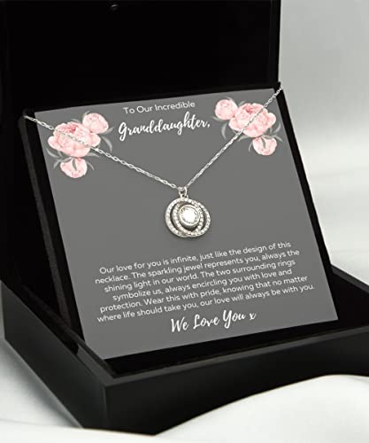 • Granddaughter Jewelry Gifts: This We Love You Necklace for granddaughters includes a card that reads “To Our Incredible Granddaughter, Our love for you is infinite, just like the design of this necklace. The sparkling jewel represents you, always the shining light in our world. The two surrounding rings symbolize us, always encircling you with love and protection. Wear this with pride, knowing that no matter where life should take you, our love will always be with you. We Love You x”