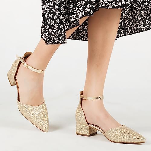 Women’s Pumps Pointed Toe Low Chunky Heels Ankle Strap Closed Toe Gold Nude Black Silver Heels Dress Wedding Pumps 6