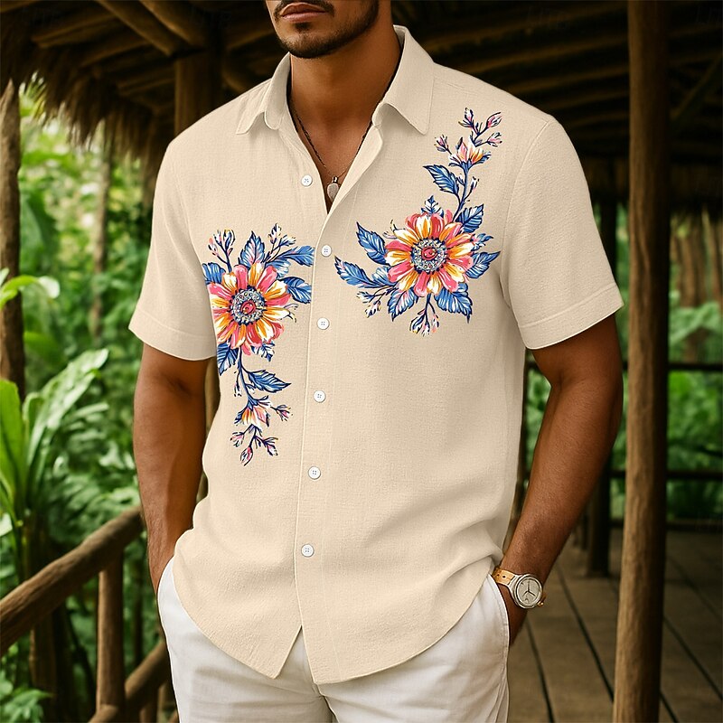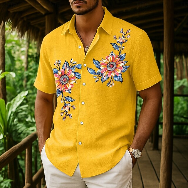 sizzling ! Men's Shirt Linen Shirt Summer Shirt Beach Shirt Button Up Shirt Floral Casual Holiday Yellow Pink Navy Blue Green Short Sleeve Turndown Summer Clothing Apparel Front Pocket