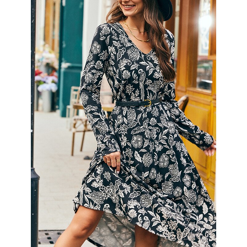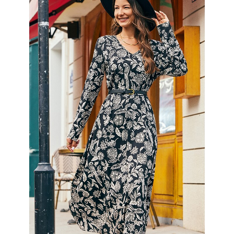 Highlights - Perfect for the winter season, keeping you warm and comfortable. - Long sleeves provide extra coverage and warmth. - Specifically designed for women, ensuring a flattering fit. - Ideal for vacations, offering a stylish and effortless look. - Features an A-line dress silhouette, enhancing your figure. - Eye-catching print design, adding a touch of uniqueness and style. - V-neckline, creating a chic and feminine look. - Midi dress length, perfect for various occasions and versatile styling options.