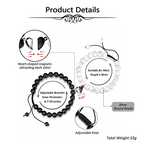 HOT ! Top Plaza 2pcs Couple Bracelets Healing Crystal Black Agate White Turquoise Bracelets for Couples Matching Heart Bracelet for Lover Him & Her Boyfriend Girlfriend Valentine's Day Gifts