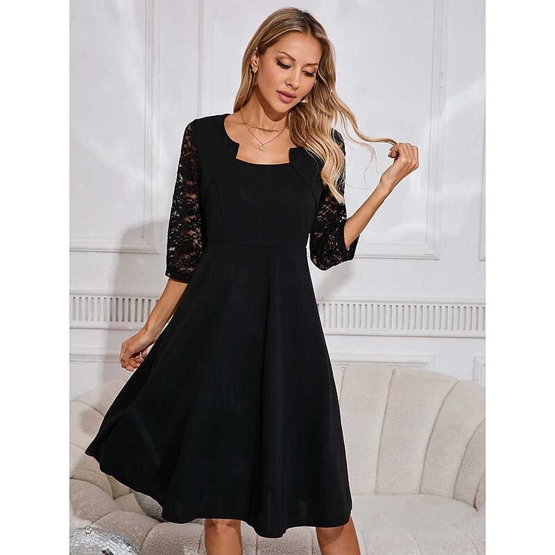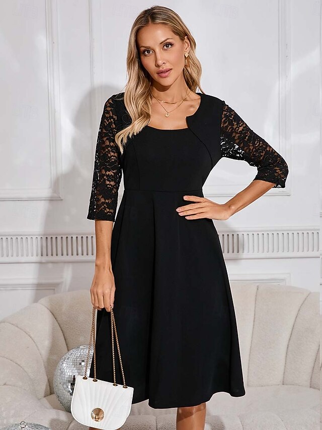 Highlights [Fabric]: Crafted from high-quality polyester, this midi dress offers a comfortable fit, perfect for the fall and winter seasons. The inelastic nature of the fabric ensures that the dress maintains its elegant structure, delivering a chic and sophisticated look. [Silhouette]: The dress boasts an elegant A-line silhouette, ideal for flattering various body shapes, offering a timeless and versatile style that suits a multitude of formal and semi-formal occasions. [Design Highlights]: Featuring exquisite bishop sleeves adorned with delicately patterned lace, this dress adds a touch of femininity and elegance. The square neckline further enhances its classic appeal, while maintaining a polished and refined appearance. [Occasions]: Perfect for work or any formal or semi-formal gathering, this black midi dress effortlessly combines style and sophistication, making it an excellent choice for fall and winter events. [Size Range]: Available in a variety of sizes including S, M, L, XL, and 2XL, ensuring a perfect fit for every body type.