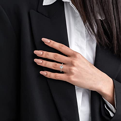 • BREATHTAKING SHINE AND SPARKLE - The oval Cemme moissanite center stone measures 9.80 x 7.00 mm, has G-H color and VS clarity, and has 2.30 Carats. The Side stones are lab-created diamonds with D-E color and VS clarity totaling 0.21 carats. Moissanites are remarkably similar to natural diamonds and, on the Mohs hardness scale is, at 9.25, the second hardest to diamonds which is a 10