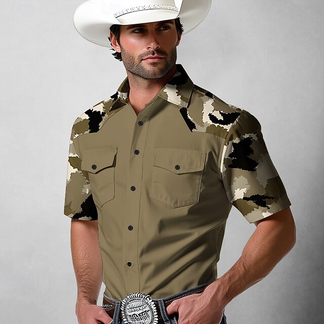 HOT ! Men's Camouflage Western Shirt Button Up Shirt Cowboy Shirt Long Sleeve Western Vintage Retro Outdoor Casual Spring Fall Turndown Collared Shirts Front Two Pockets Dark Khaki Brown Khaki