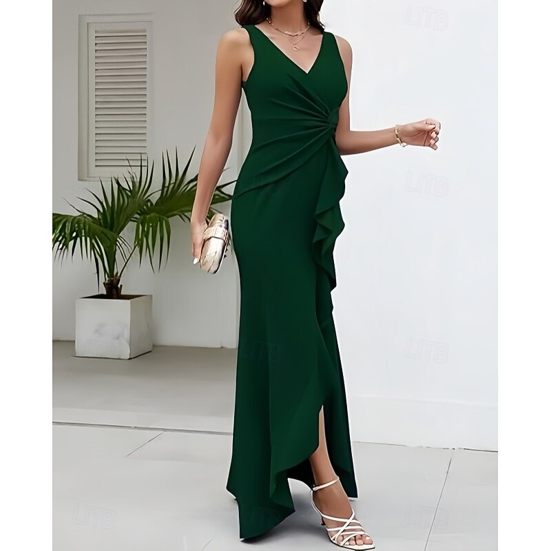 Mermaid / Trumpet Wedding Guest Dresses Elegant Dress Wedding Guest Engagement Floor Length Sleeveless V Neck Stretch Crepe with Ruched Ruffles Slit 1