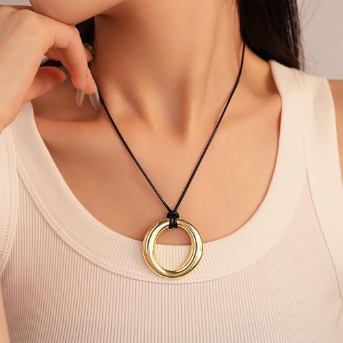 Vintage Round Circle Pendant Necklace Black Leather Choker Necklace Leather Rope Chain Necklace Gold Geometry Open Circle Necklace Jewelry for Women
