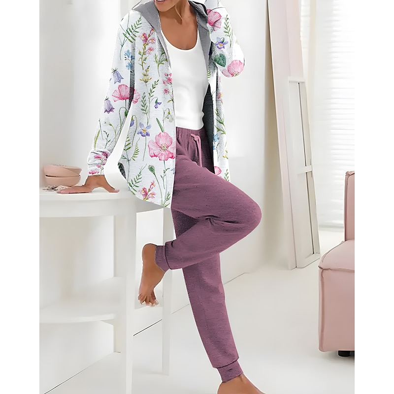 : The set features a vibrant floral print combined with a classic hooded neckline, bringing a fresh and nature-inspired look to your casual wardrobe. The 3D print technology used enhances the intricate floral design, making it stand out with realistic detail.