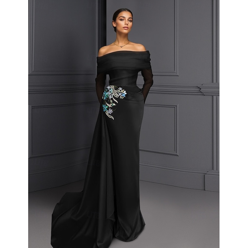 More information about Blue Black Column Evening Gown Elegant Dress Formal Wedding Floor Length Long Sleeve Illusion Neck Stretch Satin with Ruched Beading Slit 2025