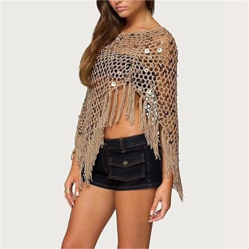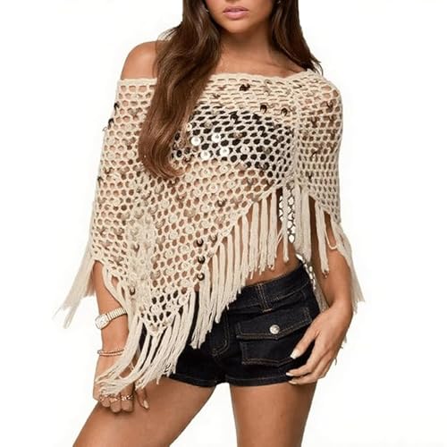 HOT ! Fringe Sequin Crochet Poncho, Sequin Ponchos Tops for Women, Sheer Mesh Poncho Shrug Bolero Sweater Shawl