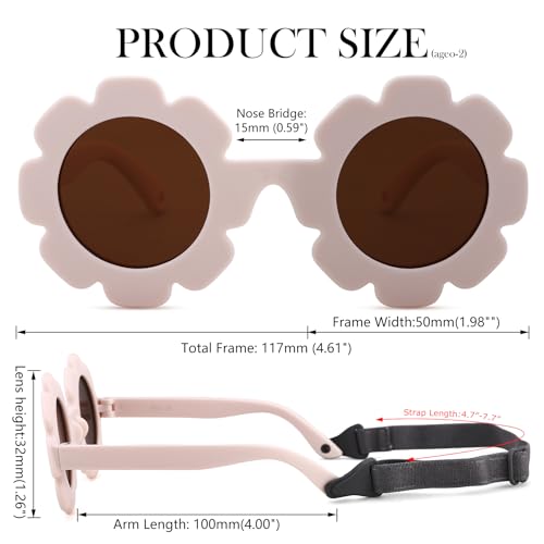 • 【Product Dimensions】- Lens Width: 32mm | Frame Height: 32mm | Nose Bridge: 10mm | Frame Width: 105mm | Temple Length: 105mm. Regular size cute toddler's flower sunglasses, polarized glasses for infant ages 0-26 months.