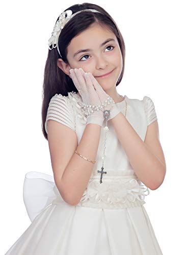 Chuangdi White Short Princess Lace Gloves First Communion Satin Gloves with Bow Tie for Girls Women Wedding Faux Pearl Decoration Party(Lace Type, White) 7