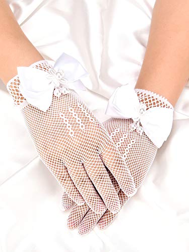 Chuangdi White Short Princess Lace Gloves First Communion Satin Gloves with Bow Tie for Girls Women Wedding Faux Pearl Decoration Party(Lace Type, White) 1