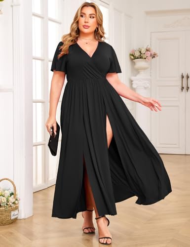 • Style: This plus size split sexy dress combines elegance with a flattering silhouette. The wrap v-neck enhances your neckline while offering a customizable fit that flatters your curves. Delicate ruffle short sleeves add a touch of femininity and charm, creating a soft, romantic feel. The a-line maxi length gracefully flows with every step, elongating your figure and ensuring a confident, sophisticated look for any occasion.