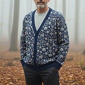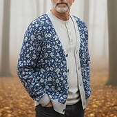 More information about Christmas Men's Ditsy Floral Flower / Plants Sweater Cardigan Sweater V Neck Retro Vintage Casual Outdoor Home Party Buckle Long Sleeve Fall Winter Blue Ink Blue